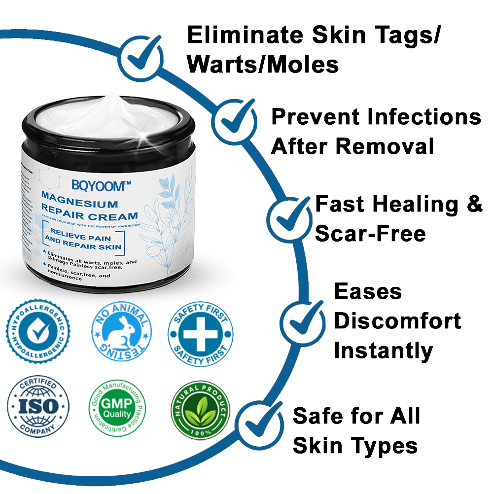BQYOOM™ Magnesium skin repair cream is specifically developed to address common skin concerns such as skin tags, warts, clogged pores, acne, pigmentation, and more. Backed by clinical research and expertise from UK healthcare professionals, it offers a natural, non-invasive, and reliable solution.