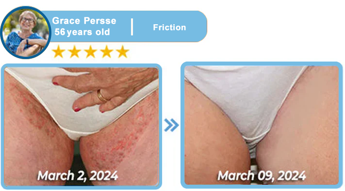 "Having chafing is the worst, the itchiness is unbearable, and it's so embarrassing trying not to scratch when I'm out in public. Wearing pants just makes it worse! I found this cream online and decided to give it a try. Honestly, it worked wonders—relieved the itch within minutes, and the inflamed area started calming down right away. After just five days, the irritation was completely gone, with no marks left behind. So glad I tried this!" - Grace Persse, Edinburgh, UK
